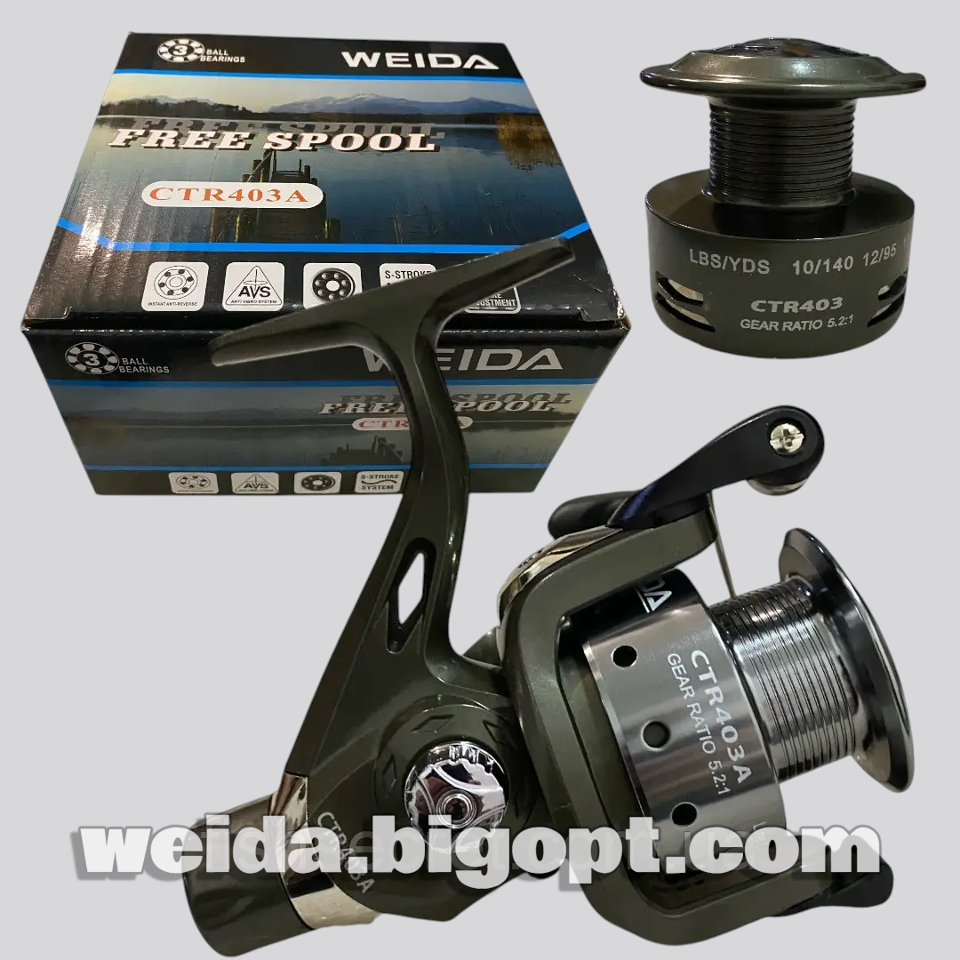 Weida CTR403A — надiйна та універсальна безінерційна катушка з заднім фрикціоном, призначена для спінінгової або фідерної риболовлі. Має алюмінієву шпулю, яка витримує навантаження, і механізм з трьома кульковими підшипниками для плавного та стабільного ходу. Завдяки протизакручуючому ролику, антиреверсу, грязезахисній конструкції та збалансованому ротору ця катушка демонструє стабільну роботу навіть при інтенсивному використанні. CTR403A — хороший вибір для рибаків, які шукають надійну та доступну за ціною снасть для щоденних виловів.