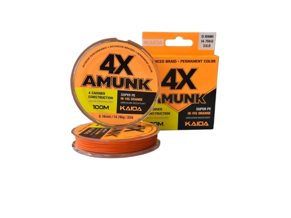Плетена волосінь KAIDA AMUNK 4X виготовлена з високоякісних волокон HMPE, що забезпечують підвищену зносостійкість, міцність та стабільність під час риболовлі. Постійний яскравий колір Hi-Vis Orange довго зберігається у воді та робить волосінь добре помітною. Завдяки гладкій поверхні, високій міцності та мінімальній розтяжності вона підходить для різних видів риболовлі.