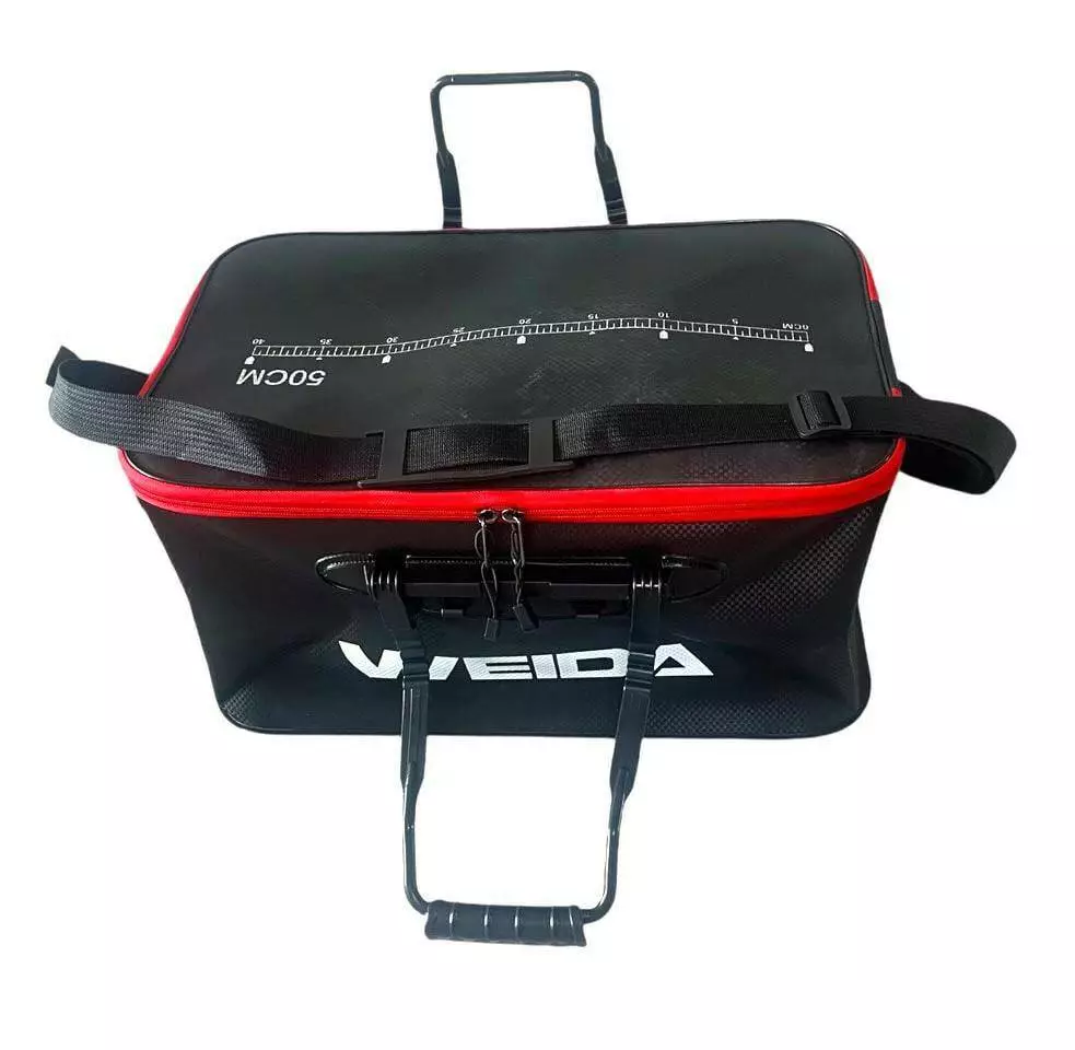 Містка рибальська сумка Weida з EVA-матеріалу призначена для транспортування улову, снастей і спорядження. Завдяки 100% водонепроникному корпусу сумка надійно захищає вміст від вологи та бруду. Жорстка форма забезпечує збереження об’єму навіть при повному завантаженні.