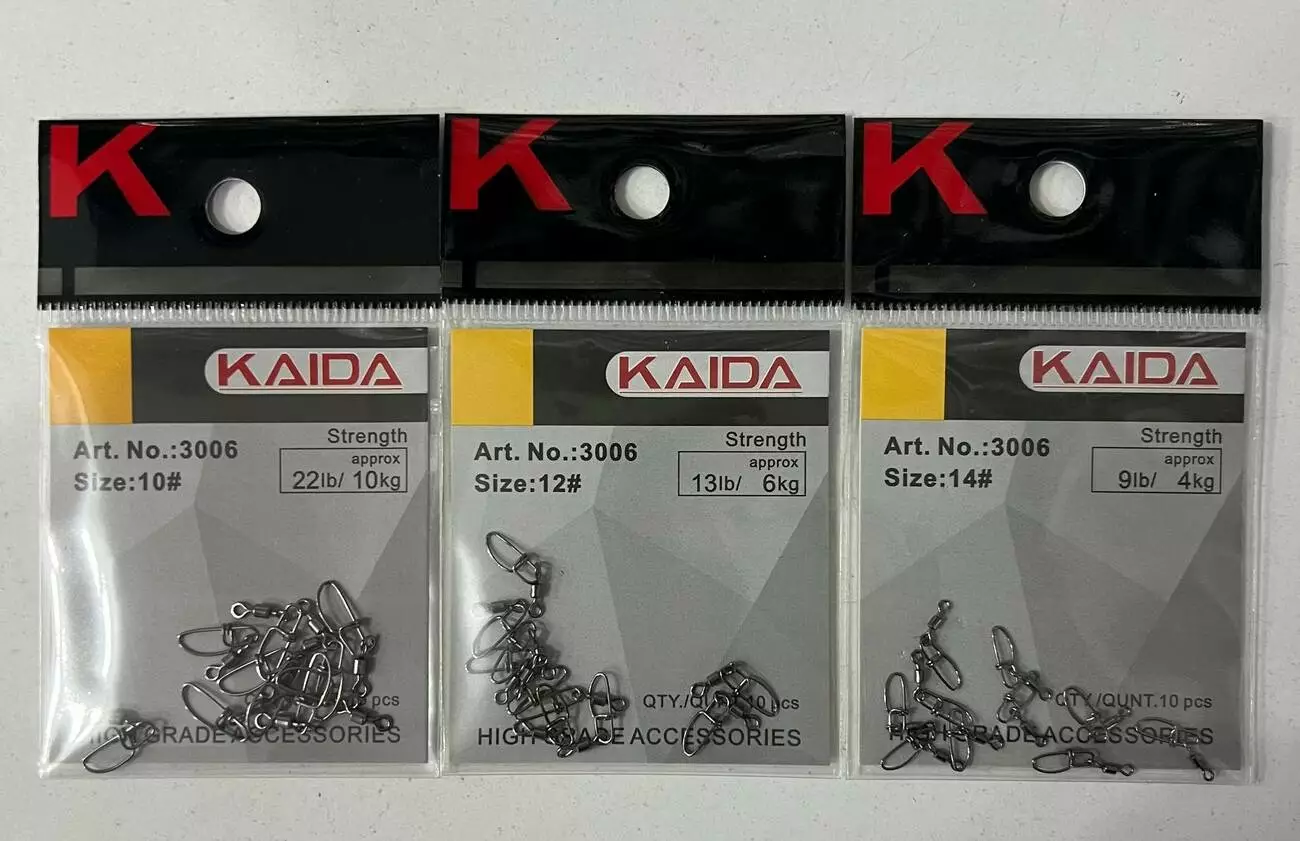 Вертлюг з застібкою KAIDA Art.3006 — практичний риболовний аксесуар для запобігання перекручуванню волосіні. Оснащений міцною застібкою для швидкої та зручної заміни оснасток і приманок. Підходить для донної, фідерної, поплавкової та спінінгової риболовлі.